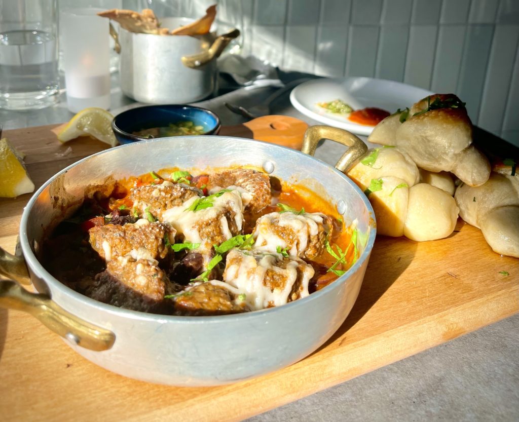 This appetizer steals the show. Vegan meatballs cooked in a lemon brown butter sauce come with melted mozzarella. It’s served in a sea of gorgeous puttanesca sauce with capers, kalamata olives and roma tomatoes. To make this dish even more perfect, there’s pillowy garlic knots.