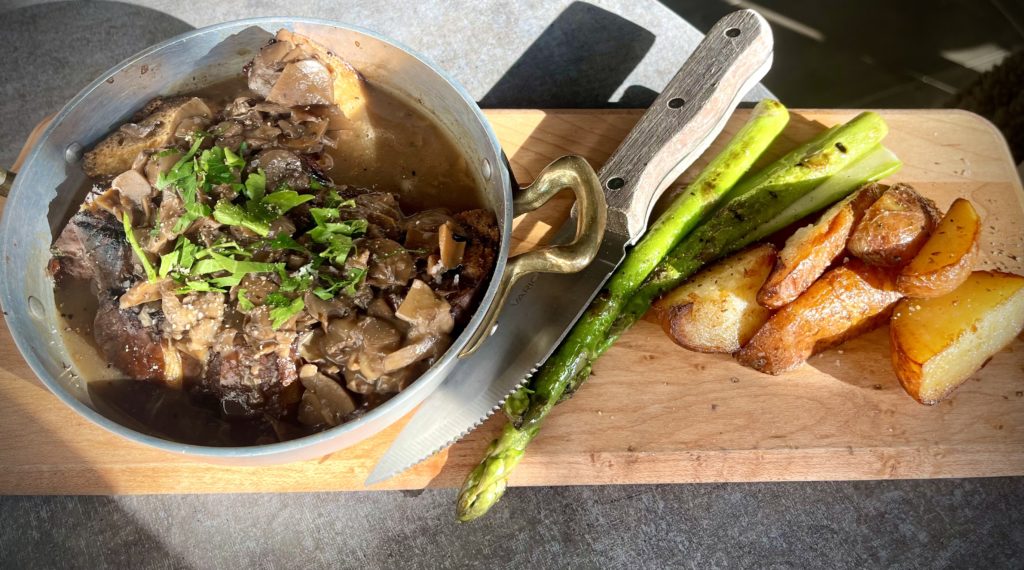 The star of the show is the “Steak” Marsala at Coletta. Smothered in a marsala suace is a seared seitan steak that’s divine. In fact, it’s one of the best seitan dishes we’ve ever had. Baked lemon potatoes and grilled asparagus spears come on the side.