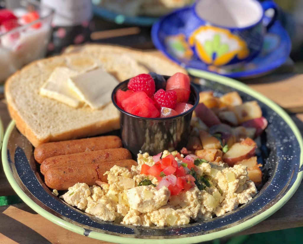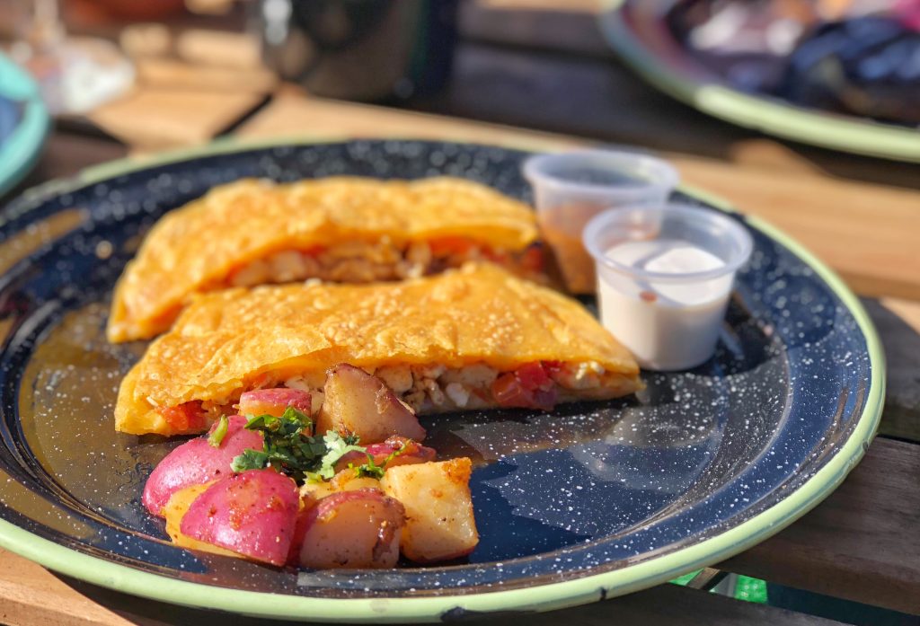 Tacotarian’s brunch also features enfrijoladas — enchiladas made with jackfruit and drenched in a creamy black bean sauce, cream and queso fresco, as well as breakfast tacos filled with tofu scramble, tortilla chips, potato, cheddar, Brussels sprouts and red pepper and the El Clasico, your classic vegan breakfast with tofu scramble, sausage links, seasoned potatoes and toast.