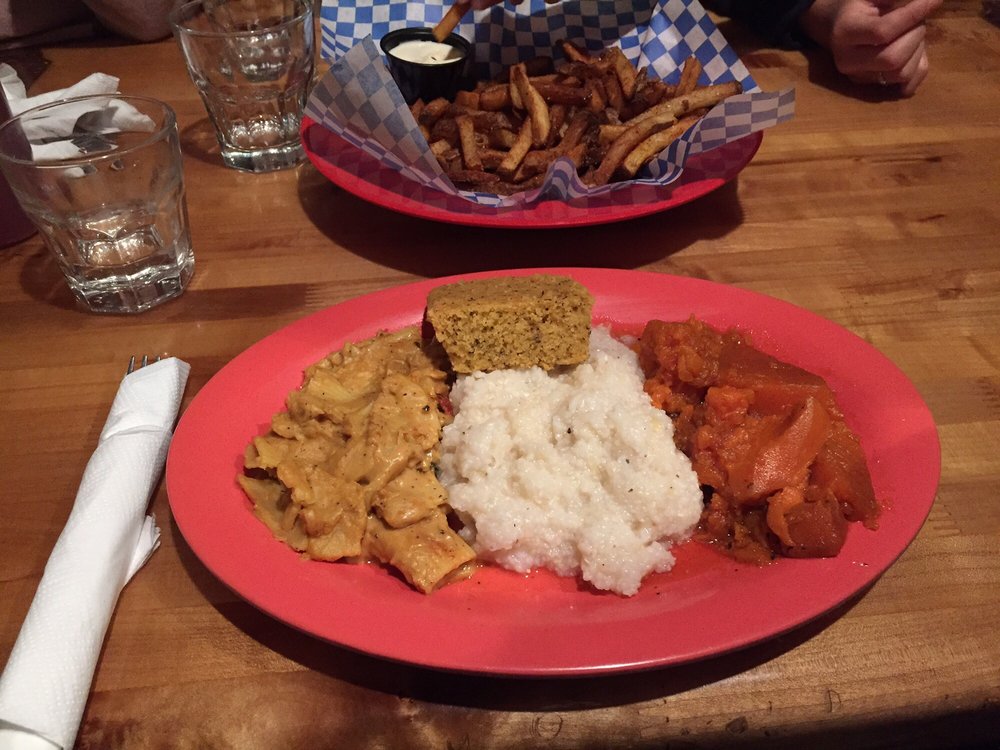 The Combination Plate at Souley Vegan: Grits, Yams, Cornbread, and Mac N Cheeze. Photo by @_plantpoweredyogi.
