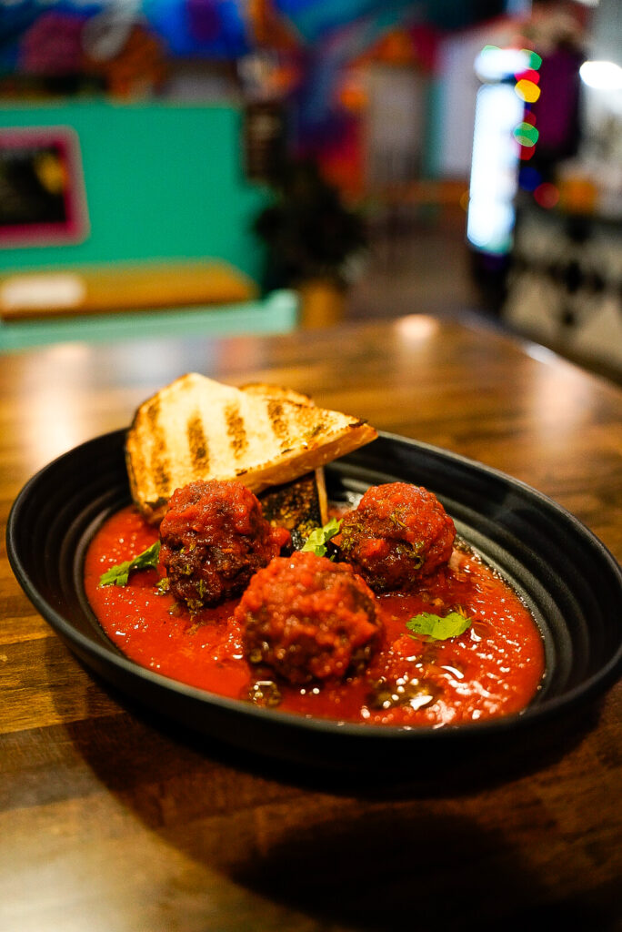 Albondigas Española’s – Abbots Butcher’s Ground Beef Spanish style meatballs, tomato chile guajillo sauce, and grilled bread
